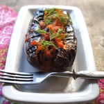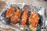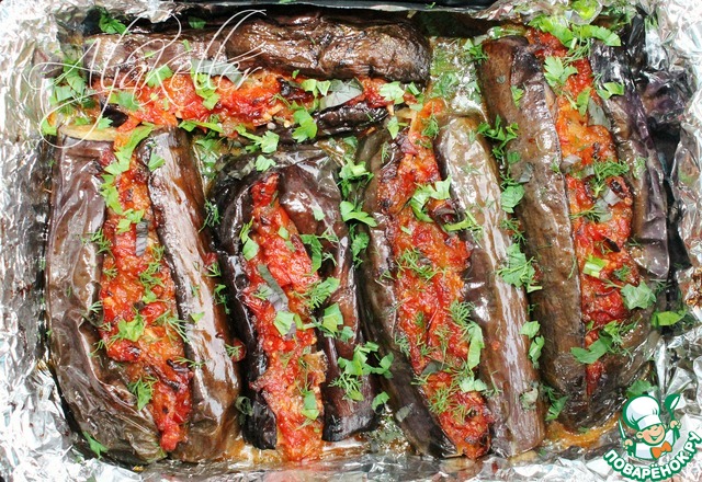 Форму застелить фольгой, на неё выложить баклажаны, заполнить надрезы начинкой, сбрызнуть водой, смешанной с сахаром и уксусом, и запекать 35-40 минут в духовке.