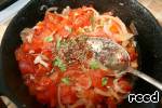Помидоры порезать кубиками и выложить их к луку и чесноку, немного обжарить. Снять с огня, добавить соль, базилик и перец.