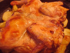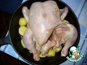 Курицу натереть снутри и снаружи солью и перцем. Положить на спинку на картошку. Старайтесь её распределить на картошке равномерно, расправьте крылышки, голени, чтобы сок, стекающий с курицы пропитал, по возможности, всю картошку. Поставить в горячую духовку на средний огонь на 45 минут.