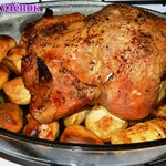 Через 45 минут достать блюдо из духовки, аккуратно, чтобы изнутри курицы не вытек сок, лучше двумя вилками, выложить курицу на тарелку. Картошку в форме перевернуть другой стороной, посолить и поперчить сверху. Опять взять курицу и положить сверху, на уже на брюшко. Сок из курицы пусть выливается на картошку. Если вылился сок на тарелку, то им тоже полейте курицу. И отправьте курицу опять в духовку на 45 минут. Потом вытаскиваете, можете даже не проверять - она будет готова, и картошка тоже. Имейте ввиду, что картошка очень быстро заканчивается, поэтому, по возможности, делайте её больше. Это блюдо можно разнообразить - добавлять к картошке другие овощи. Но, лично мне, нравится простой вариант, который я написала. Приятного аппетита!