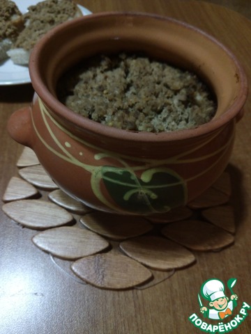 Раскладываем получившуюся массу в формочки. Сверху кладём смалец (сливочное масло).