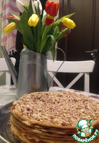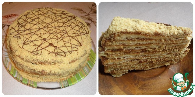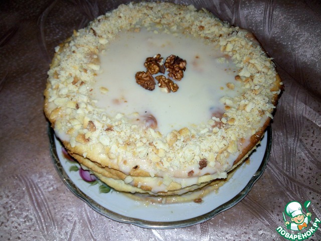 Сборка и выпечка торта ведется одновременно. Каждый выпеченный корж тут же надо смазать вареной сгущенкой, т. к. они при остывании становятся твердыми и ломкими. Каждый последующий корж укладывая на предыдущий... прижимать полотенцем, слегка придавливая.