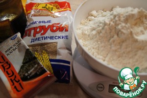 Отвешиваем необходимое количество муки, отрубей. Если хотите хлеб потемнее, то можно добавить концентрат квасного сусла (жидкий 2 ст.л), но при этом количество жидкости уменьшить на 2 ст.л. Так же можно подкрасить хлебушек добавив 2 ст.л растворимого цикория (но это всё по желанию).