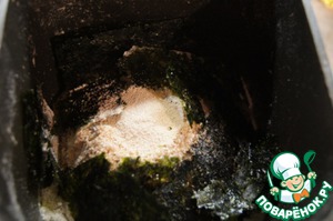 В чашу ХП помещаем ингредиенты, согласно инструкции вашей хлебопечки. У меня вначале заливаются жидкие ингредиенты, а затем все сухие. Поверх всего выкладываем морскую капусту, я её особенно не измельчаю, так как после замеса она всё равно не будет видна. Выставляем режим «ОСНОВНОЙ» 3 часа 40 минут, цвет корочки средняя или тёмная.