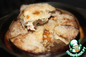 Закрыть хлебными ломтиками, залить яйцом и сливками и посыпать сахаром.