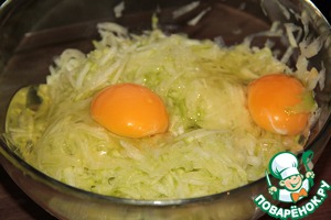 • На крупной терке натереть кабачки и добавить 2 яйца.