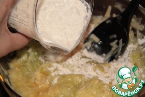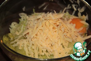 На крупной терке натереть кабачки и добавить 2 яйца.