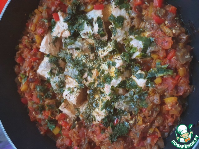 По календарю уже осень, но все летние овощи еще на прилавках! Так что спешу поделиться одним из моих любимых летних рыбных рецептов. Рыбка получается сочная, нежная и очень ароматная! Хотя овощи и готовятся вместе с рыбой, они абсолютно не имеют неприятного рыбного запаха. В общем, попробуйте, очень рекомендую!