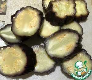 Баклажаны - отрезать плодоножку, целиком отварить (воду не солить!!!) 10-15 минут (в зависимости от размера) до готовности, они не должны расползаться. Когда остынут нарезать на колечки толщиной 1 см.