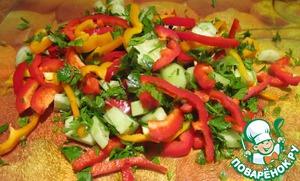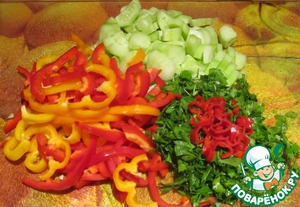 Перец режем соломкой, огурцы полукольцами, острый перец и петрушку мелко, всю эту смесь размешиваем.