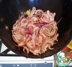 Обжариваем лук полукольцами, добавляем нарезанную грудинку и тушим 10 мин.