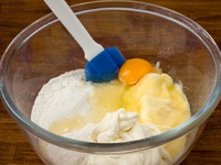 Добавить в просеянную муку разрыхлитель, соль, размягченное масло, сахар, яйцо и сметану. |