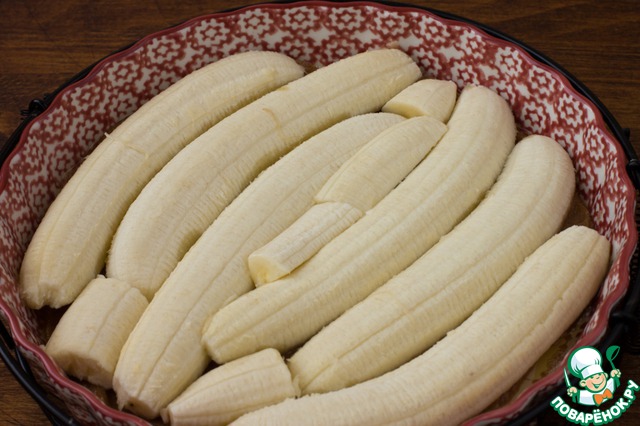 Разрежьте бананы вдоль и выложите срезом на карамель. |