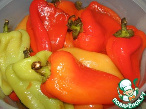 Перец помыть, высушить на полотенце. Масло раскалить на сковородке, (масло не нужно использовать все сразу, у меня 2 кг умещаются за 3 захода, вот по 50 мл и наливаю). Выкладываем перчики за хвостики и обжариваем по пару минут с каждой стороны до состояния, пока не начнет отслаиваться шкурка. Перекладываем их в мисочку глубокую, чтобы удобно было чистить, и еще теплые отделяем от шкурки, она очень легко снимается, сок и масло, которое стекает нам нужно будет для маринада, не выливаем. От ножек и семян чистить не нужно, складываем их аккуратно в баночку или лоточек, где будем хранить и послойно заливаем маринадом.