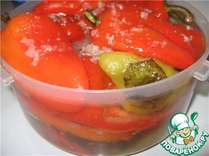 Для приготовления маринада будем использовать масло и сок, которые остались от жарки и чистки (только масло должно быть не горелое), добавляем соль, сахар и подогреваем почти до кипения, добавляем давленый чеснок и уксус и заливаем послойно перчики. Маринад должен получиться одновременно и кислым, и сладким, и острым, насыщенным одним словом.