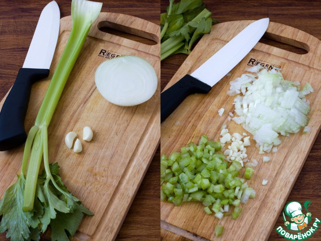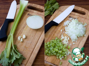 • Пока варится фасоль, берем небольшую луковицу, черешок сельдерея и зубчики чеснока, нарезаем их мелко.