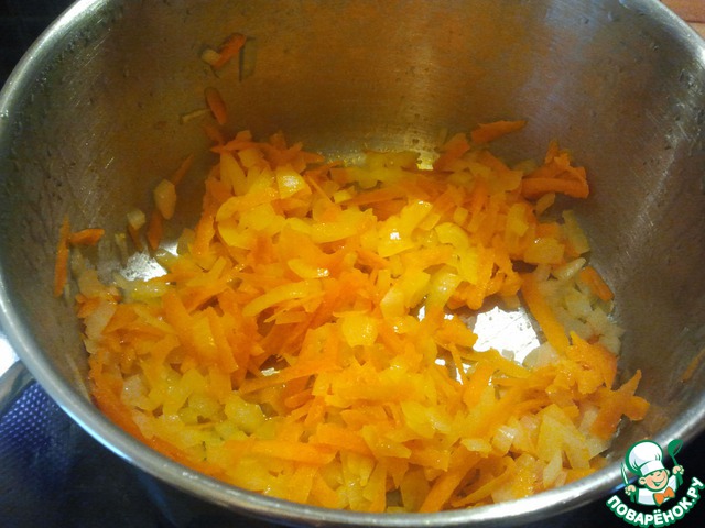 За это время очистить и порезать мелко лук, почистить и натереть морковь. Закинуть овощи в кастрюлю, добавить 1/2 ст. л. сливочного масла и потушить мин. 5. Добавить муку, хорошо перемешать.