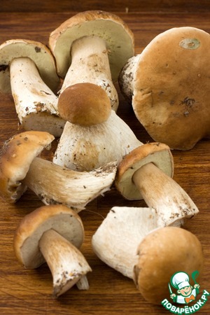 Для этого рецепта подходят только молоденькие, крепенькие боровички. Искренне надеюсь, что я не единственный человек, кто имеет возможность собирать (или покупать) такие грибы. Мы грибы собираем в Подмосковье. Конечно, не все такие идеально красивые, как на фото. Остальные экземпляры пошли на сушку, маринование и в заморозку.