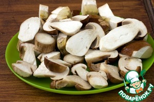 Никогда не заливайте грибы водой! Они впитают ее всю и потеряют товарный вид. Многие червивые грибы замачивают в крепком соленом растворе, червяки покидают свои норки, но я так не делаю, все равно потом есть эти грибы не смогу. Чтобы очистить грибы от грязи, оботрите влажной рукой шляпку и ножку или быстро промойте под проточной водой. Ту грязь, что не смылась, счистите ножом. Порежьте боровички на достаточно крупные куски.