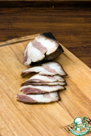 Нарежьте тонкие пластины копченого сала. Я всегда храню в морозилке кусочек сала натурального копчения. Оно обугленное, почти черное, зато коптят его на натуральной ольховой стружке. Вредно, но как вкусно! А аромат!