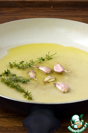 Разогрейте на сковороде оливковое (гулять - так гулять) или растительное (без запаха) масло, бросьте раздавленые ножом прямо в кожуре зубчики чеснока и веточки тимьяна (все три веточки на фото - тимьян, просто разных видов). По кухне тут же станет распространяться чудный аромат.