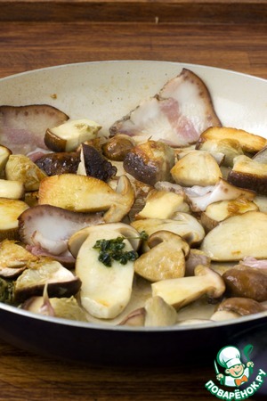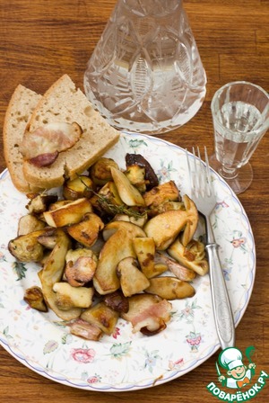 Запахло? Добавляем грибы, жарим на сильном огне, быстро - минуты две с каждой стороны, до образования румяной корочки. А теперь сало. Даем ему немного подтаять, посолить и поперчить! Все, можно закусывать! Пардон, кушать.))