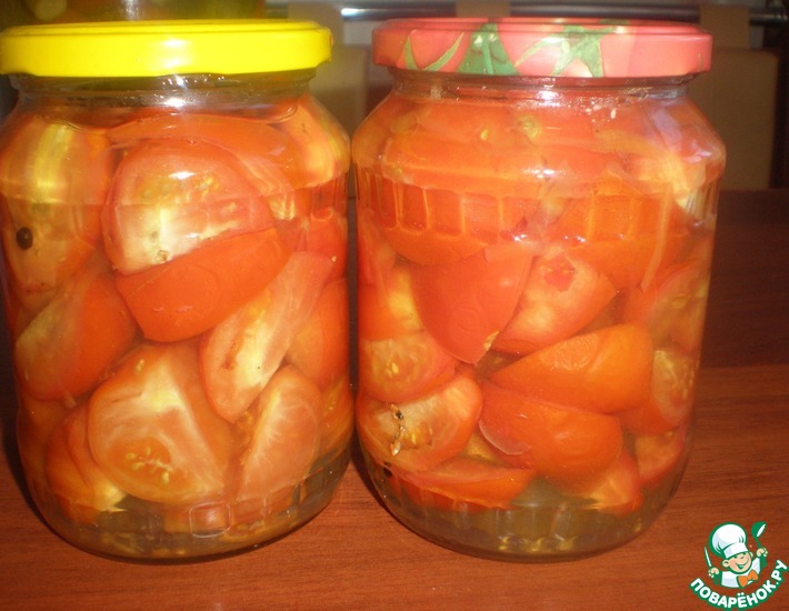 Горячей заливкой залить помидоры, пастеризовать 0,5 л - 10 мин., 1 л - 20 мин.