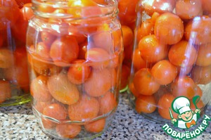 Подготовить банки: промыть, просушить и подержать в духовке при 110 градусах 10 минут. Вынуть, подождать, пока они остынут, и загрузить мытыми мелкими помидорчиками. Помидорки надколоть вилкой, чтобы кожа не лопалась.