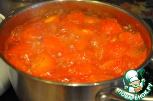 Крупные томаты вымыть, порезать на 4 части и загрузить в пятилитровую кастрюлю, предварительно налив полстакана холодной воды, и поставить вариться.