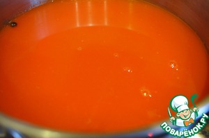 Когда помидоры размягчатся, разбить их погружным блендером прямо в кастрюле, затем пропустить через сито, протирая деревянной ложкой. Готовую массу перелить в чистую кастрюлю и варить минут 15, пока не появится пенка.
