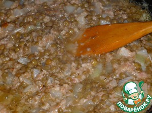 Обжарьте чечевицу вместе с нарезанным луком и мясным фаршем, посолите по вкусу.