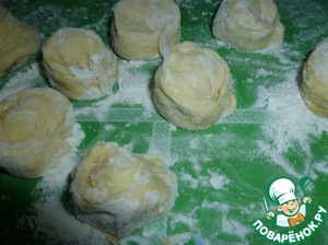 Когда тесто подойдет (увеличится вдвое), отрезайте от него кусочки, раскатывайте их в круглые пласты.