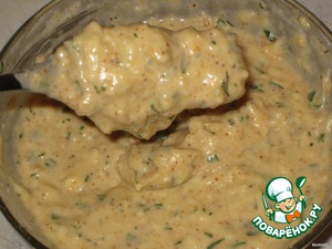 Яйцо взбить с солью, добавить сметану. майонез, панировочные сухари, перец, порезанный мелко укроп, тертый сыр. Все хорошенько перемешать. Консистенция должна быть густоватой, чтобы ложка стояла.