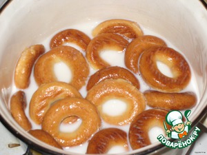 Сушки замочить в подсоленном молоке на 5-10 минут. Чтобы слегка размокли. Лучше за ними следить, периодически трогать, сушки разные бывают.