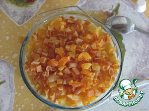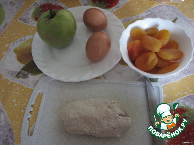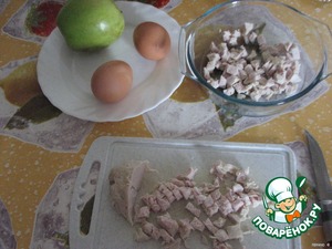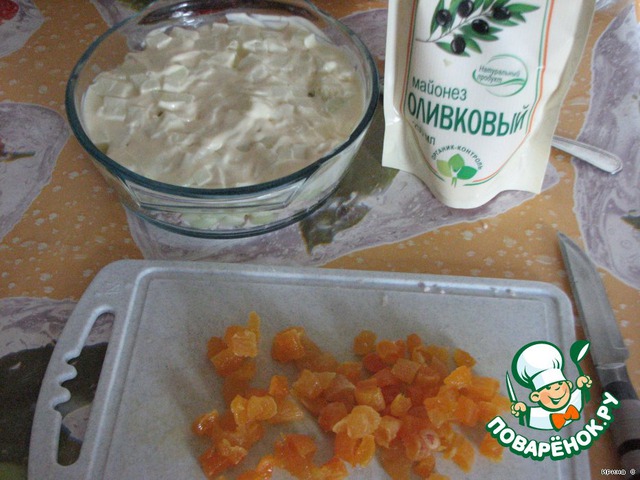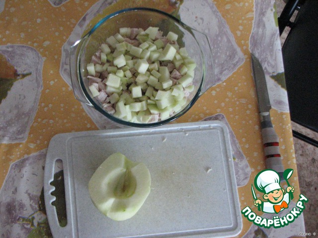 Яблоко очистить от кожуры и сердцевины. Нарезать кубиками и выложить на курицу. Майонез.