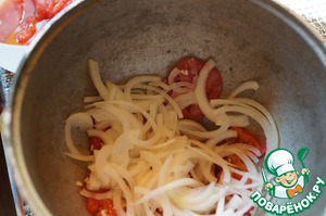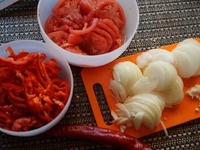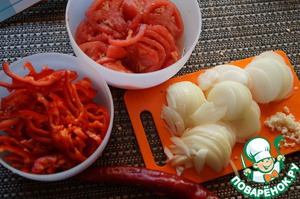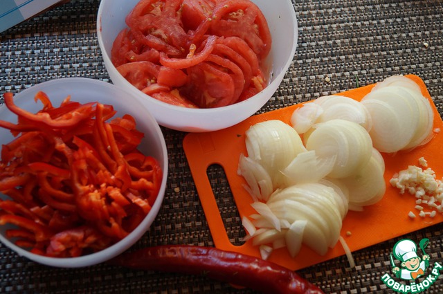 Ошпариваем кипятком помидоры, снимаем кожицу и режем кружками. Лук очищаем и режем тонкими кольцами. Мелко нарезаем чеснок и острый перец (можно половинку). Болгарский перец режем тонкими полосками. |