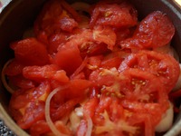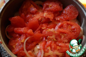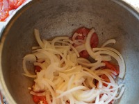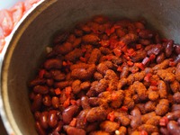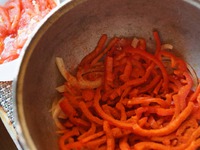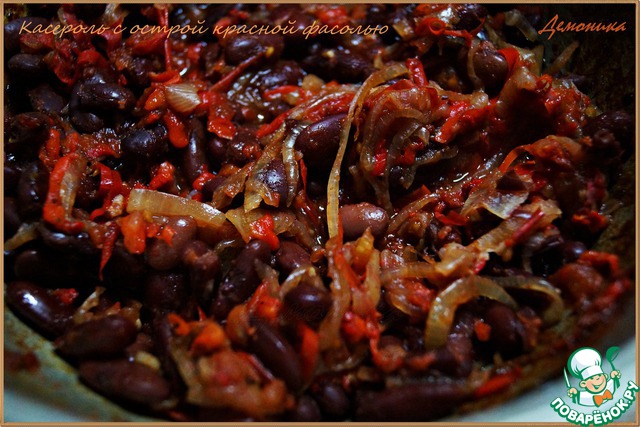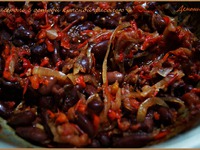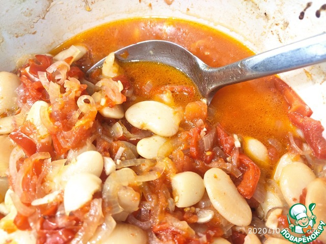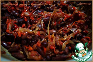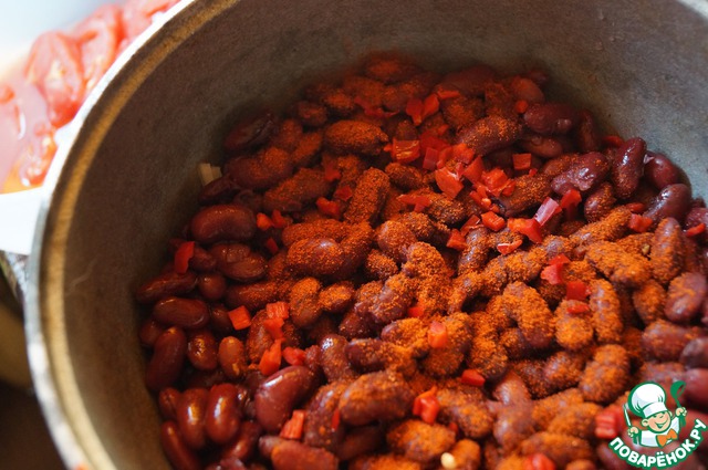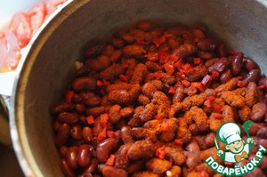 Выкладываем всю фасоль (без жидкости). Далее, в обратном порядке: паприка, чеснок, перец, лук... |