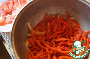 На лук - половину всего болгарского перца. Посыпаем острым перцем, чесноком и 1 ч. л. паприки. |