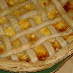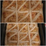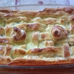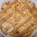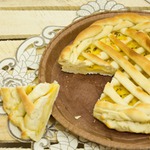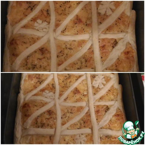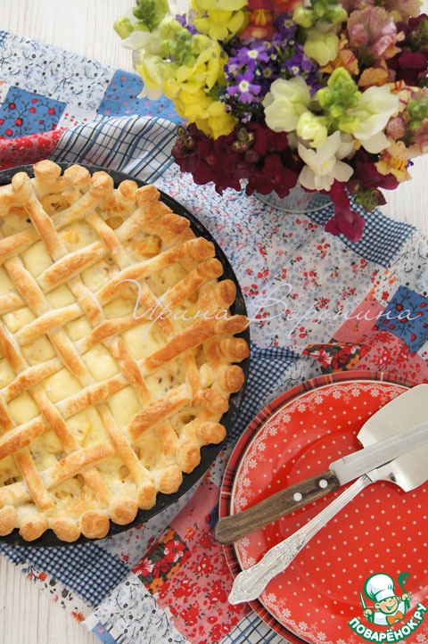 Можно просто накрыть пирог второй половиной теста, а можно вот так накрыть начинку полосками.