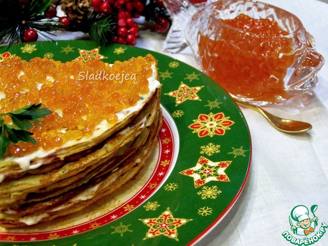 Выпекаем несладкие блины по любому рецепту который любим.Промазываем каждый блинчик плавленым сырком.Складываем блинчики стопочкой и прижимаем.Верхний блин обкладываем икрой и даем настояться.Можно сделать слой икры еще между слоями блинчиков.