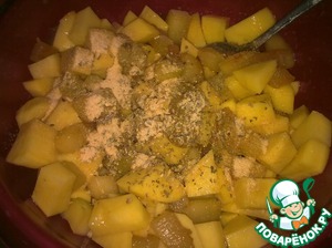 Картошку почистим, порежем на кубики, добавим к обжаренным кабачкам. Приправим базиликом, орегано, майораном и чесноком. Солим, перчим по вкусу.