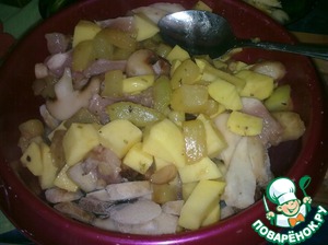 Добавим филе к кабачкам и картошке, перемешиваем, добавляем шампиньоны прям в мороженом виде.