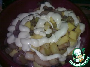 Заливаем майонезом (для диеты подойдет вариант со сметаной вместо майонеза) и тщательно перемешиваем.