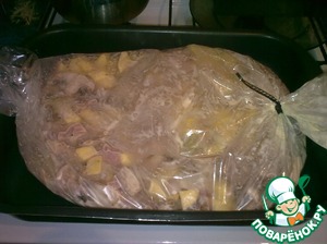 Складываем все в рукав и ставим в духовку 220 градусов на 45-50 мин. За 10-15 мин. до готовности вскроем рукав и оставим подрумяниваться.