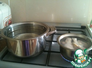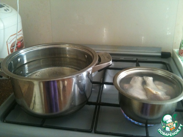 Наливаем в кастрюлю 1,5 литра воды, кладем туда ножку (или грудку). Как вода закипит и появится пенка, снять пенку. Я делаю немного иначе: в маленькой кастрюльке отвариваю ножки минут 10, затем уже ножки перекладываю в «основную» кастрюлю и довариваю ножку уже в большой кастрюле (на фото я показала это). Маленькая кастрюлька нам уже не нужна.