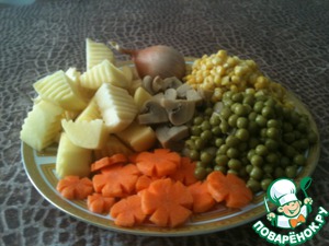 Когда все сварилось, добавить оставшиеся ингредиенты: зеленый горошек, кукурузу, шампиньоны, зелень, сливки и поварить минуты 2-3. Зелень со сливками можно положить в тарелки перед подачей на стол.