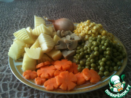 Иногда я добавляю в бульон вместе с кукурузой и горошком омлет: пару яиц взбить вилкой, немного посолить и готовить на сковороде со сливочным маслом. Готовый омлет порезать на кусочки и отправить в кастрюлю. Получается тоже очень вкусно!!!