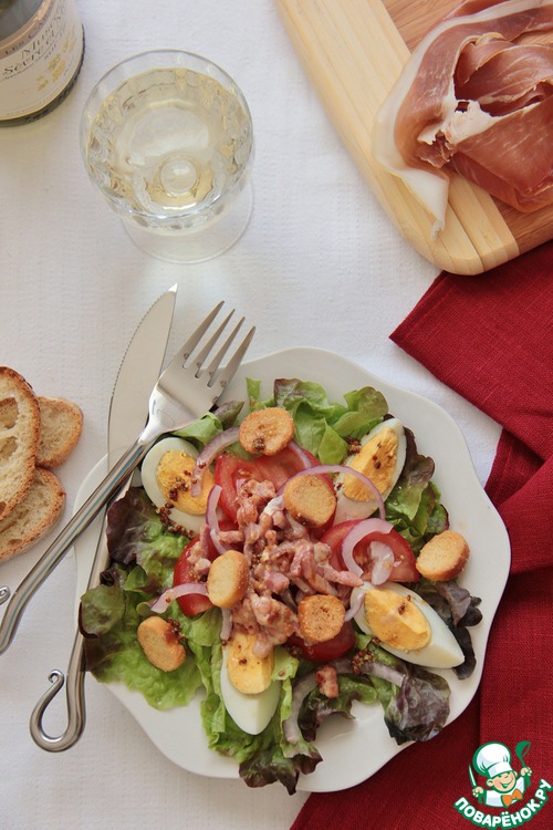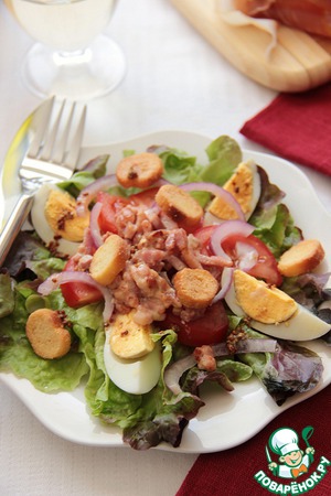 На тарелку или в блюдо выложить листья салата, в центр - помидоры, выложить четвертинки яйца, лук, посыпать сухариками, добавить еще теплый бекон, полить соусом. Перемешать и кушать.