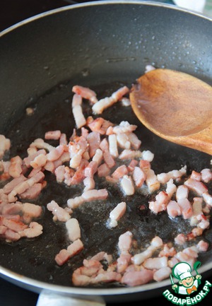 Бекон нарезать, обжарить без масла до золотистого цвета. В конце жарки к бекону добавить ложку сметаны. Пока жарится бекон, приготовить соус: смешать уксус, растительное масло и горчицу.