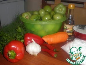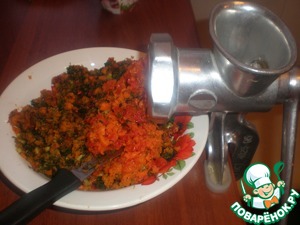 Перекручиваем перцы, моркoвь, чеснок, зелень.